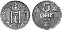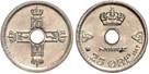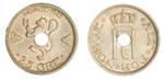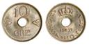Nominaler: 20 / 10 / 2 / 1 kroner, 50 / 25 / 10 / 5 / 2 / 1 øre.